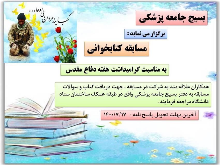 اطلاعیه برگزاری مسابقه کتابخوانی به مناسبت گرامیداشت هفته دفاع مقدس ۲۹ شهریور ۱۴۰۰ | ۱۱:۲۴ کد : ۲۰۲۹۴ اطلاعیه ارسال به دیگران نام شما ایمیل شما ایمیل دریافتکننده ارسال انصراف تعداد بازدید:۲۶۲۰۸