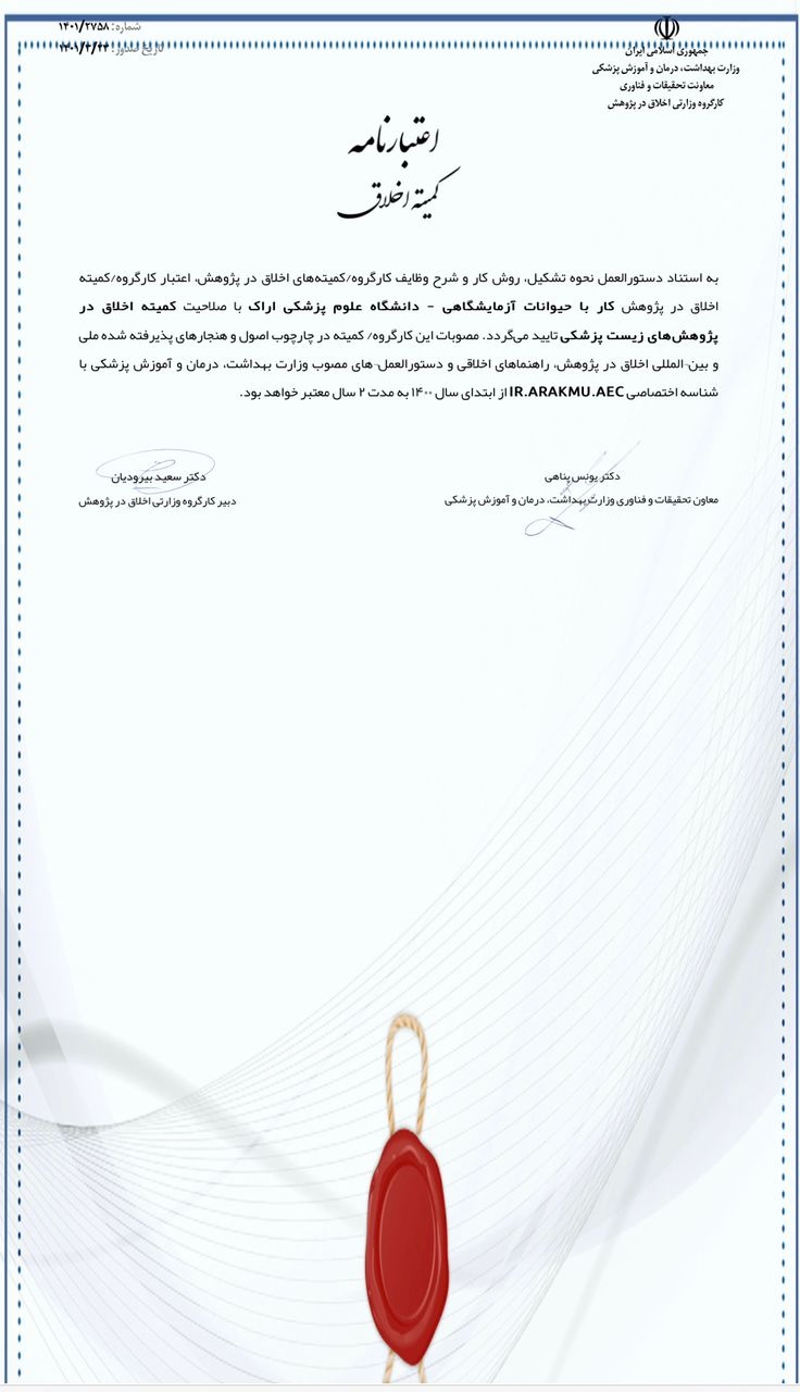 اخذ اعتبار نامه کمیته اخلاق در پژوهش کار با حیوانات آزمایشگاهی برای دانشگاه علوم پزشکی اراک ۰۱ تیر ۱۴۰۱ | ۰۷:۲۲ کد : ۲۷۲۴۶ اطلاعیه ارسال به دیگران نام شما ایمیل شما ایمیل دریافتکننده ارسال انصراف تعداد بازدید:۱۷۰۰۸