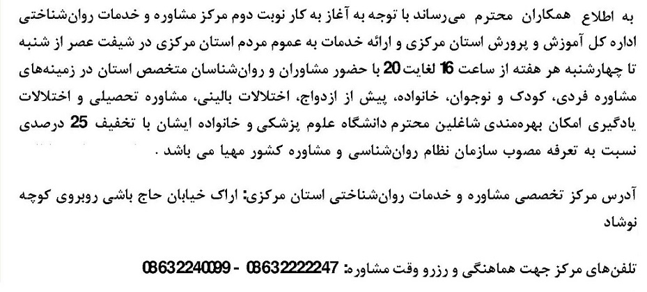 مرکز تخصصی مشاوره وخدمات روانشناختی ۱۲ آبان ۱۴۰۳ | ۱۳:۰۴ کد : ۴۷۳۷۱ اطلاعیه ارسال به دیگران نام شما ایمیل شما ایمیل دریافتکننده ارسال انصراف تعداد بازدید:۹۳۵۳ آغاز به کار نوبت دوم (شیفت عصر) مرکز تخصصی مشاوره و خدمات روانشناختی اداره کل آموزش و پرورش استان مرکزی و ارائه خدماات با تخفیف ۲۵ درصدی به شاغلین دانشگاه علوم پزشکی