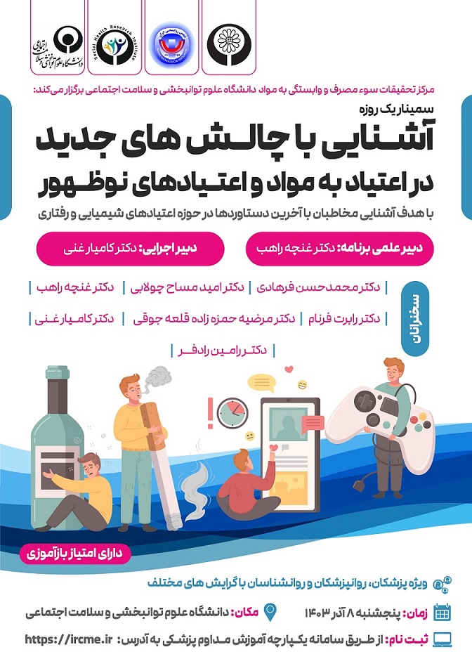 مرکز تحقیقات سوءمصرف و وابستگی به مواد دانشگاه علوم توانبخشی و سلامت اجتماعی ، با توجه به اهمیت و ضرورت به روزرسانی دانش و تبادل اطالعات در زمینه درمان اعتیاد، در نظر دارد سمینار یک روزه با عنوان «آشنایی با چالش های جدید در اعتیاد به مواد و اعتیادهای نوظهور» در تاریخ ۸ آذرماه سال جاری برگزار نماید.