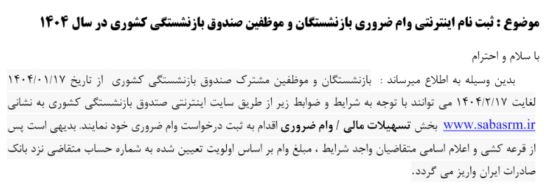 ثبت نام اینترنتی وام ضروری بازنشستگان و موظفین صندوق بازنشستگی کشوری ۲۰ فروردین ۱۴۰۴ | ۱۱:۵۹ کد : ۵۰۶۴۱ اطلاعیه ارسال به دیگران نام شما ایمیل شما ایمیل دریافتکننده ارسال انصراف تعداد بازدید:۳۶۸۳ ثبت نام اینترنتی وام ضروری بازنشستگان و موظفین صندوق بازنشستگی کشوری