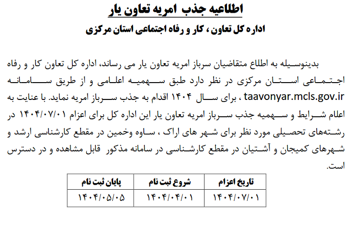 اطلاعیه جذب امریه تعاون یار ۱۱ تیر ۱۴۰۴ | ۱۲:۰۴ کد : ۵۲۷۴۸ اطلاعیه ارسال به دیگران نام شما ایمیل شما ایمیل دریافتکننده ارسال انصراف تعداد بازدید:۶۸۱ اطلاعیه جذب امریه تعاون یار